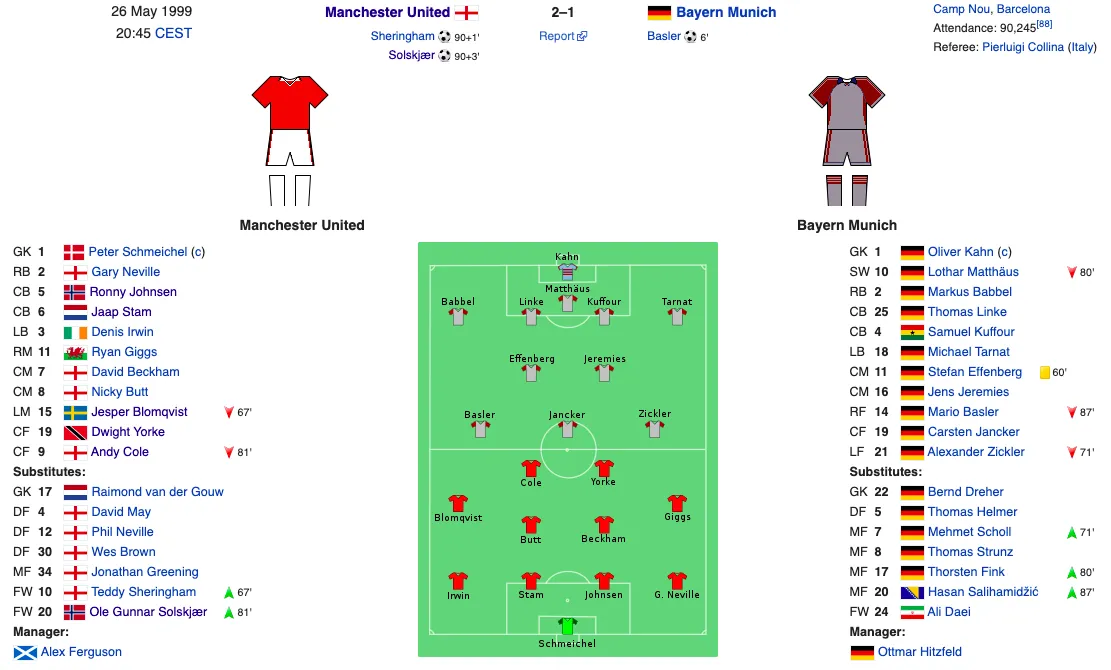 Le Bayern Munich sera le dernier challenge à surmonter pour Ferguson avant de réaliser le triplé. En revoyant les images du match, on se rend bien compte que le football a bien changé depuis mai 1999. Le Camp Nou de Barcelone est complètement plein, le 4-4-2 est à la mode et pas seulement pour juste défendre, et le libéro (Matthäus) joue derrière la ligne de défense plutôt qu’en 6 juste devant. Pierluigi Collina, arbitre mythique des années 90, peut enfin officier une finale après 7 finales disputées d’affilée par des clubs italiens. Les Munichois arrivent avec une grande équipe, presque entièrement constituée d’allemands, dont nombreux vainqueurs de l’Euro 1996. Kahn contre Schmeichel, Jancker contre Stam, Linke contre Cole. Les duels étaient partout, dans une époque où le ballon passait beaucoup plus de temps en l’air qu’au sol et où on ne partait pas de derrière pour construire une attaque.