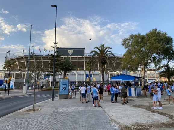 Si cette affiche ressemble à un match de bas de tableau de Liga, il s’agit en réalité d’une rencontre de Liga 2. Relégué il y a trois ans, le Málaga CF regrette sûrement aujourd’hui ses belles années. Il est loin le temps des Demichelis, Isco, Cazorla et cie. L’époque où le club se faisait sortir en quarts de LDC par Dortmund. Non, désormais, cela s’apparente plutôt à des saisons mitigées qui se terminent dans le ventre mou de la Liga 2 Smart Bank. Pendant que les fans sont nostalgiques de leurs années dorées, je rentre dans le stade et part à la recherche de ma place. Pour 12€, je me retrouve assis dans l’angle côté tribune populaire avec une bonne vision du terrain.