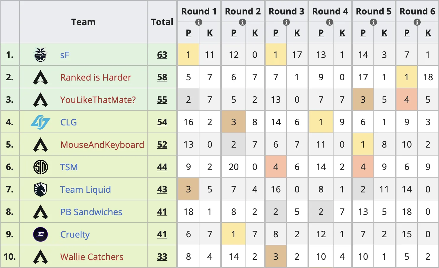 Il fallait s’accrocher en NA et savoir bien compter les points pour dire qui l’emporterait finalement. Auteurs d’une dernière partie d’anthologie, les Ranked is Harder ont seulement échoué à la deuxième place. Auteurs d’un magnifique top 1 assorti de 18 kills (!), ils ont marqué 30 points en une partie… soit 2 de plus que lors des 5 précédentes. Ils terminent seulement derrière solaFide, équipe la plus régulière de ces ALGS Winter #1. Couter Logique est 4e, tandis que la Team SoloMid se classe seulement 6e, juste devant Team Liquid. Ces équipes sont elles aussi qualifiées pour les prochaines finales, et n’auront pas non plus à repasser par les qualifiés, semés d’embûches.