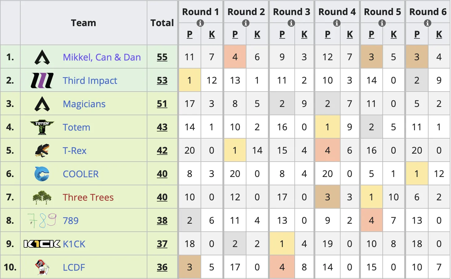 En Europe, bien que le OT1 ait déjà eu lieu, les résultats ont bien été annulés et rejoués ce week-end. La principale “surprise” est venue de l’élimination de North en demi-finales, tandis que ses anciens joueurs, renommés sous la bannière Mikkel, Can & Dan se sont imposés en finale. Leur parcours n’aurait pourtant pas laissé paraître ce résultat, tant ils n’ont pas été impériaux pendant les phases de qualifications. Au final, ils devancent Third Impact et les Magicians dans un mouchoir de poche ; mais seuls les deux premiers sont directement qualifiés pour les Playoffs. Les 8 autres équipes du Top 10 sont en revanche bel et bien qualifiées pour les prochaines finales disputées lors du Online Tournament 2. Ce dernier prendra place du 19 au 21 Février prochain.