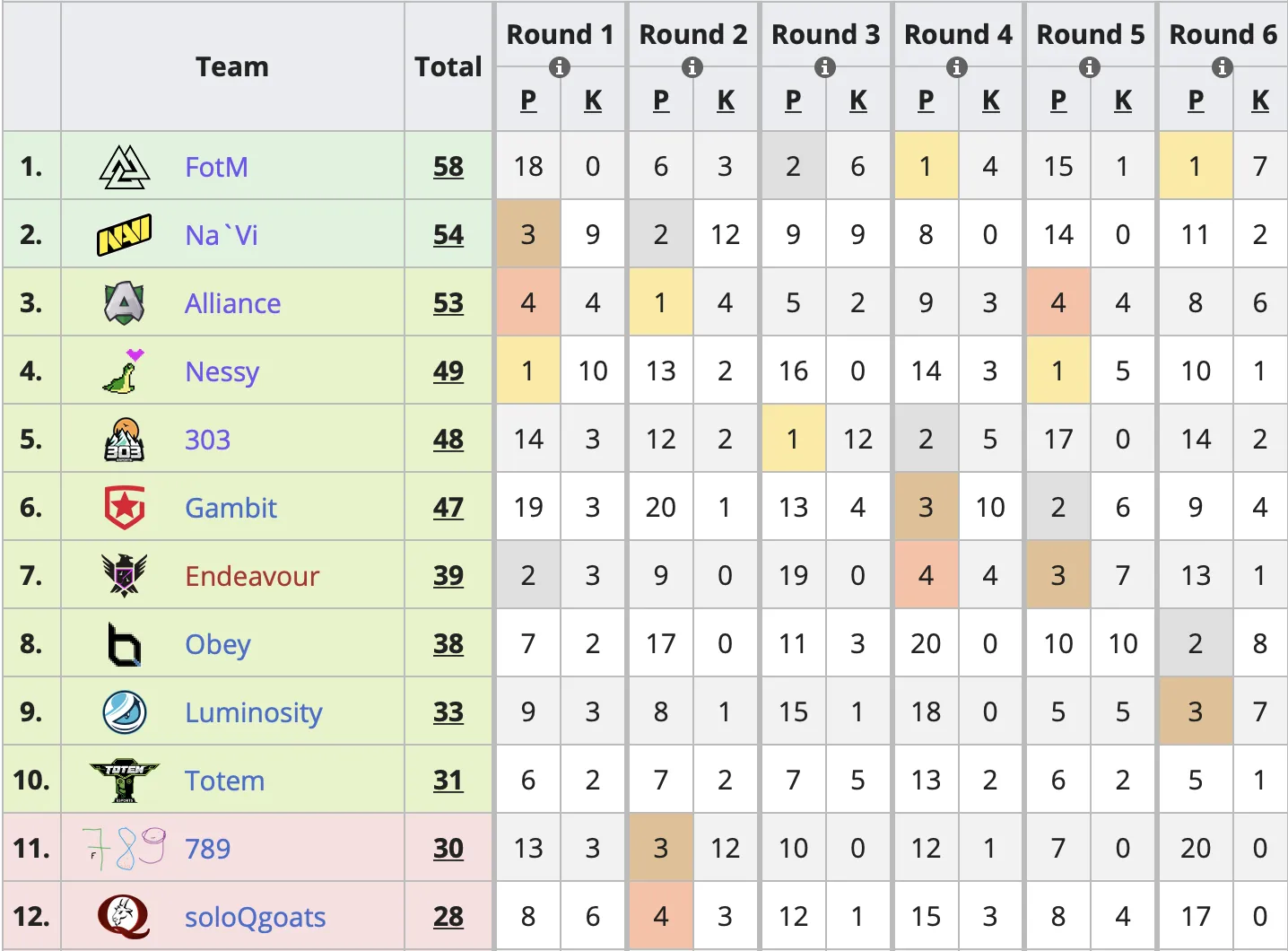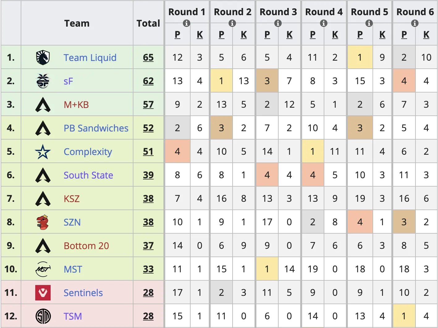Qualifiée lors de l’OT1, l’équipe solaFide, composée de Dezignful, Resultuh et Gentrifyinq n’a une fois de plus rien laissé au hasard. Deuxième de cet OT3, après une première place lors de l’OT1 et une 5e lors de l’OT2, la formation américaine est clairement la chef de file de la région NA. Craquage complet pour Counter Logic Gaming, dernière avec seulement 1 point (!) en 6 parties. Jouer à deux en compétitif n’est clairement pas une bonne idée. Heureusement, la qualification fut acquise la semaine dernière. Team Liquid, équipe très régulière également, décroche enfin son billet pour les playoffs, tout comme Mouse and Keyboard.