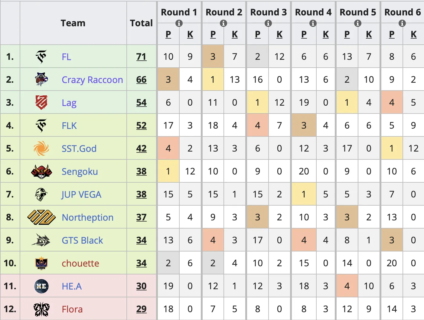 On s’était habitué à une certaine régularité au sein de la région APAC North, avec des T1 deux fois dans le Top 3. Cette fois, pas de coréen à l’horizon, ce sont bien les Japonais de Fennel qui se sont imposés, intégrant enfin le haut de tableau après une 4e place encourageante la semaine dernière. Ils sont accompagnés une nouvelle fois de Crazy Raccoon, les Japonais faisant donc le doublé, après une première place la semaine dernière. Le podium est complété par Lag Gaming, structure également basée au Japon. Les Nippons étaient très en forme ce week-end, comme en témoigne ce podium très homogène. Fennel Korea échoue à la 4e place, à deux petits points des 3e. Le spot, déjà acquis lors de l’OT 1, n’était donc pas la priorité.
