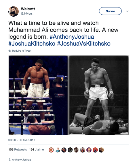 AJ puise son inspiration et sa force chez les plus grands champions. Sa plus grande inspiration reste Mohamed Ali à qui il rend hommage régulièrement et notamment lors de ses entrées. Il arbore en effet très souvent un peignoir blanc, comme celui de Cassius Clay. Il veut ainsi rendre hommage à celui qui lui a fait aimer la boxe et suit le chemin des légendes de ce sport. Le fait que le costume ne soit peut-être pas à sa taille ne semble absolument pas lui faire peur, bien au contraire, il est largement à la hauteur de ses prédécesseurs. Il y a effectivement un rapport très fort qui a toujours unit le champion olympique et le champion du monde. Nous avons tout d’abord pu le voir avec Mohamed Ali, qui en 1960 remporte la médaille d’or des mi-lourds et devient le champion des poids lourds que l’on connaît. C’est ensuite Joe Frazier qui domine la catégorie après avoir remporté la médaille olympique en 1964 à Tokyo. En 1968, c’est l’Américain George Foreman qui lui succède en créant la surprise à Mexico où il domine le Soviétique Jonas Čepulis. Il sera le champion de cette catégorie entre 1973 et 1974. Puis c’est le grand Lenox Lewis qui s’impose aux Jeux Olympiques de Séoul dans la catégorie poids lourds, il sera le champion du monde de cette catégorie dans les années 90. Enfin, l’une des dernières légendes de cette catégorie est le géant Ukrainien, Wladimir Klitschko, qui devient le champion olympique aux jeux d’Atlanta. Il restera le grand champion de cette catégorie jusqu’au 29 avril 2017, date où il a affronté le nouveau monstre qu’est Anthony Joshua. Ce combat fut mythique. Dés son entrée AJ a mis le feu, il se présente devant les 90 000 spectateurs de Wembley entre ses initiales enflammées. Anthony Joshua compte devenir le maître de cette catégorie poids lourds. Mais Klitschko ne comptait pas laisser sa place aussi facilement et met même Anthony Joshua au tapis lors de la cinquième reprise. Mais à vaincre sans péril, on triomphe sans gloire et Anthony l’a bien compris ce soir-là. C’est après onze rounds impressionnants qu’il donne le coup fatal, une combinaison crochet du droit/uppercut va sonner la fin du combat. L’arbitre met fin au calvaire de Klitschko, mais il met aussi fin à sa domination. A 41 ans, Wladimir Klitschko passe définitivement le flambeau au jeune britannique.