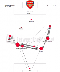 Sur le terrain, le spectacle fait peine à voir. Mikel Arteta s'entête dans son 3-4-3, victorieux la saison dernière, mais qui n'est plus une surprise pour ses adversaires. Surcharger les ailes oblige les adversaires à doubler les couloirs, mais Arsenal ne dispose d'aucun relais performant au milieu qui permettrait de passer rapidement d'une aile à l'autre. Partey étant blessé, c'est Xhaka, Elneny et Ceballos qui se partagent les deux postes, tous aussi ternes les uns que les autres. Sans milieu, une construction en U prévisible et inoffensive se met en place, comme on peut le voir sur cette “passmap” tirée du match contre Everton. Il est d'ailleurs intéressant de noter que la seule victoire maîtrisée en Premier League des Gunners est celle contre Manchester United, qui jouait avec un milieu en losange, laissant totale liberté aux Gunners sur les ailes.