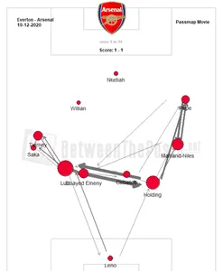 Sur le terrain, le spectacle fait peine à voir. Mikel Arteta s’entête dans son 3-4-3, victorieux la saison dernière, mais qui n’est plus une surprise pour ses adversaires. Surcharger les ailes oblige les adversaires à doubler les couloirs, mais Arsenal ne dispose d’aucun relais performant au milieu qui permettrait de passer rapidement d’une aile à l’autre. Partey étant blessé, c’est Xhaka, Elneny et Ceballos qui se partagent les deux postes, tous aussi ternes les uns que les autres. Sans milieu, une construction en U prévisible et inoffensive se met en place, comme on peut le voir sur cette “passmap” tirée du match contre Everton. Il est d’ailleurs intéressant de noter que la seule victoire maîtrisée en Premier League des Gunners est celle contre Manchester United, qui jouait avec un milieu en losange, laissant totale liberté aux Gunners sur les ailes.