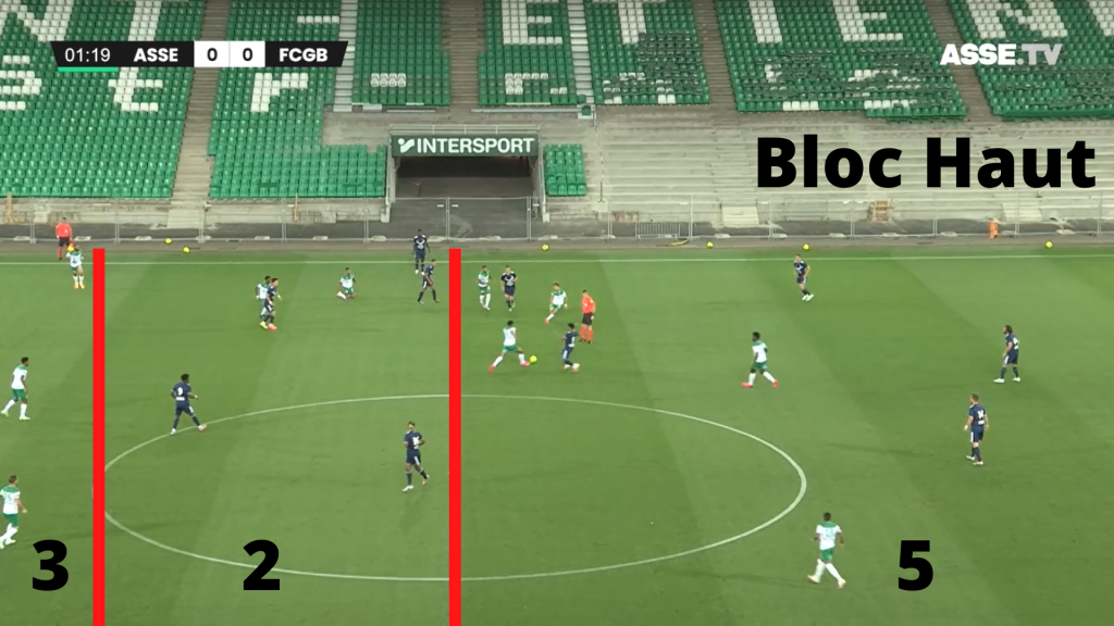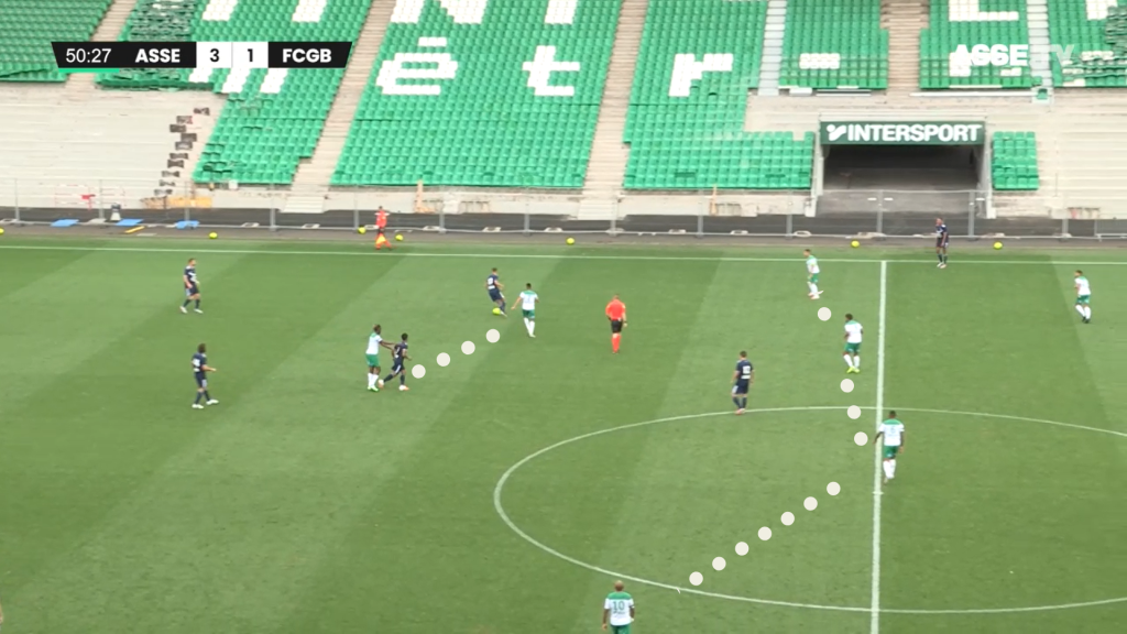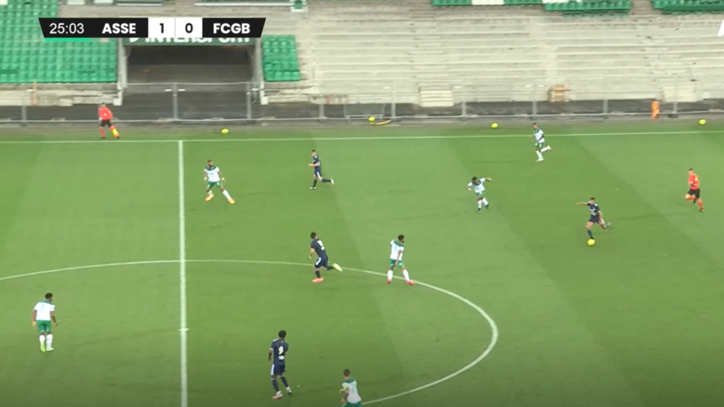 Si le premier pressing est intéressant, le replacement lui est parfois trop aléatoire et l'alignement pas toujours respecté. Sur cette image qui fait suite à une récupération au niveau du poteau de corner bordelais, on voit que la moitié des stéphanois sont déjà en retard et derrière le ballon et qu'un 3 contre 3 se profile avec des joueurs comme Moukoudi et Debuchy qui sont loin d'être rapides et un grand espace (ici 40m) à couvrir. Cette situation se terminera par une frappe contrée mais a été le vrai problème stéphanois, problème aussi connu sur les transitions défensives après coups de pieds arrêtés.