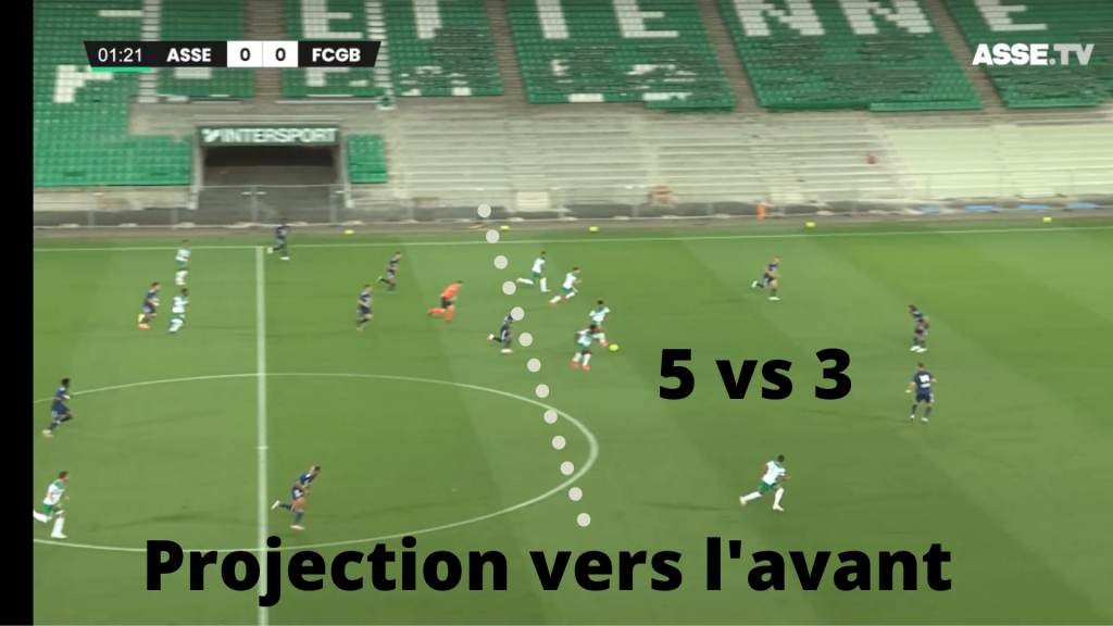 La première relance. Fofana, Moukoudi ont très bien réussi en première période et ont permis aux Verts d'avoir une bonne possession de balle et de nombre situations offensives grâce à ces relances qui ont cassé des lignes. En deuxième mi-temps avec une charnière jeune, M'Vila est venu mettre en confiance ses coéquipiers en prenant en charge la première relance avec qualité.