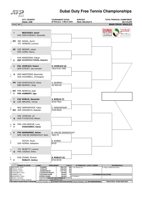 ATP 500 Dubaï : le tableau complet