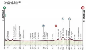 De Riccione à Mordano, cette troisième étape sera elle aussi parfaitement adaptée aux sprinters. En effet, avec seulement 3 petites ascensions au programme, les coureurs vivront certainement une de leurs journées les moins difficiles. Longue de seulement 151,3 km, cette étape devrait permettre à une équipe déterminée de contrôler la course sans trop de soucis.
