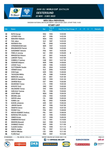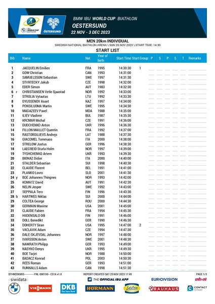 Biathlon 2023 Östersund : la startlist individuel homme