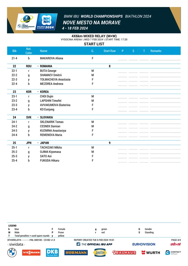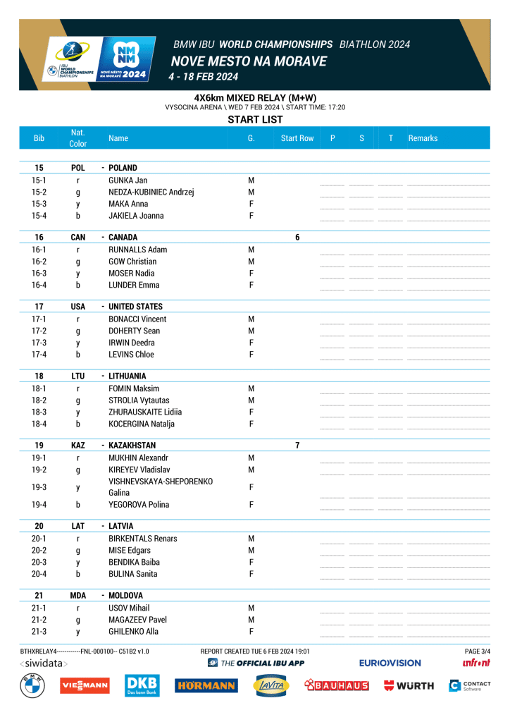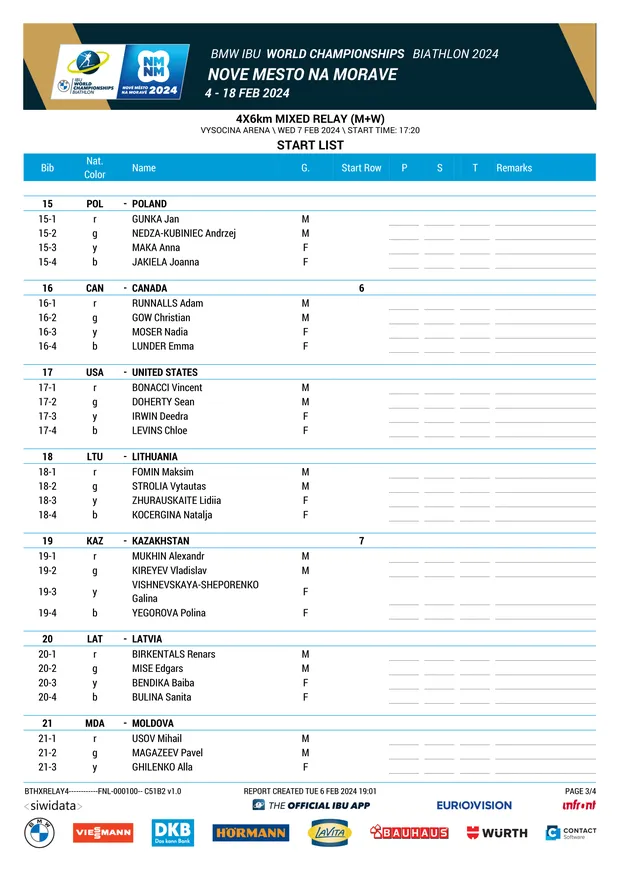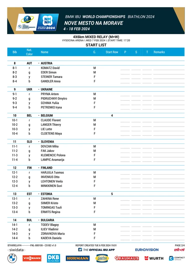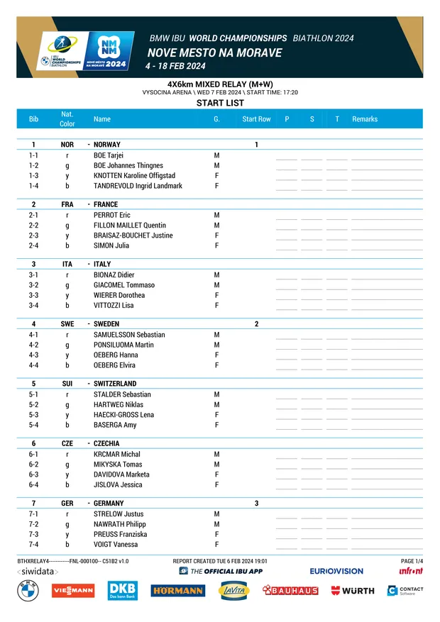 Découvrez la liste de départ du relais mixte des Championnats du Monde de Biathlon 2024 à Nove Mesto (République Tchèque). Le départ de la course sera donné ce mercredi 7 février, à 17h20.