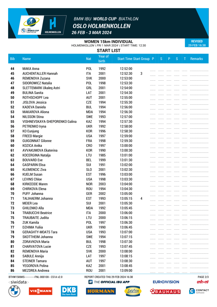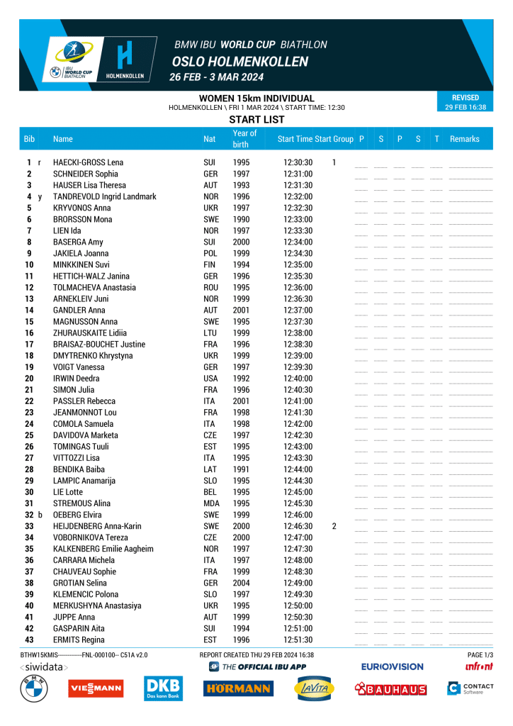 Biathlon Oslo 2024 – Liste de départ individuel Femmes