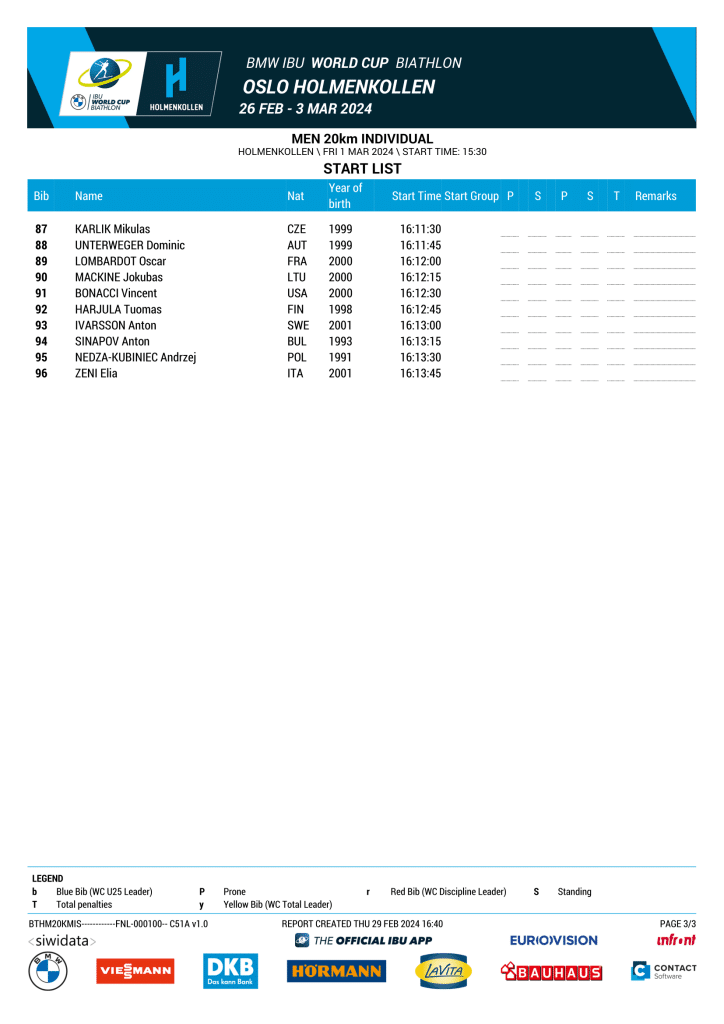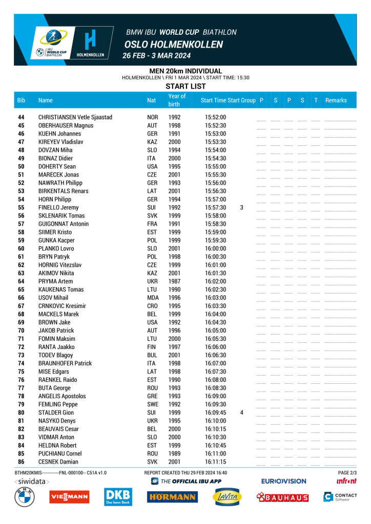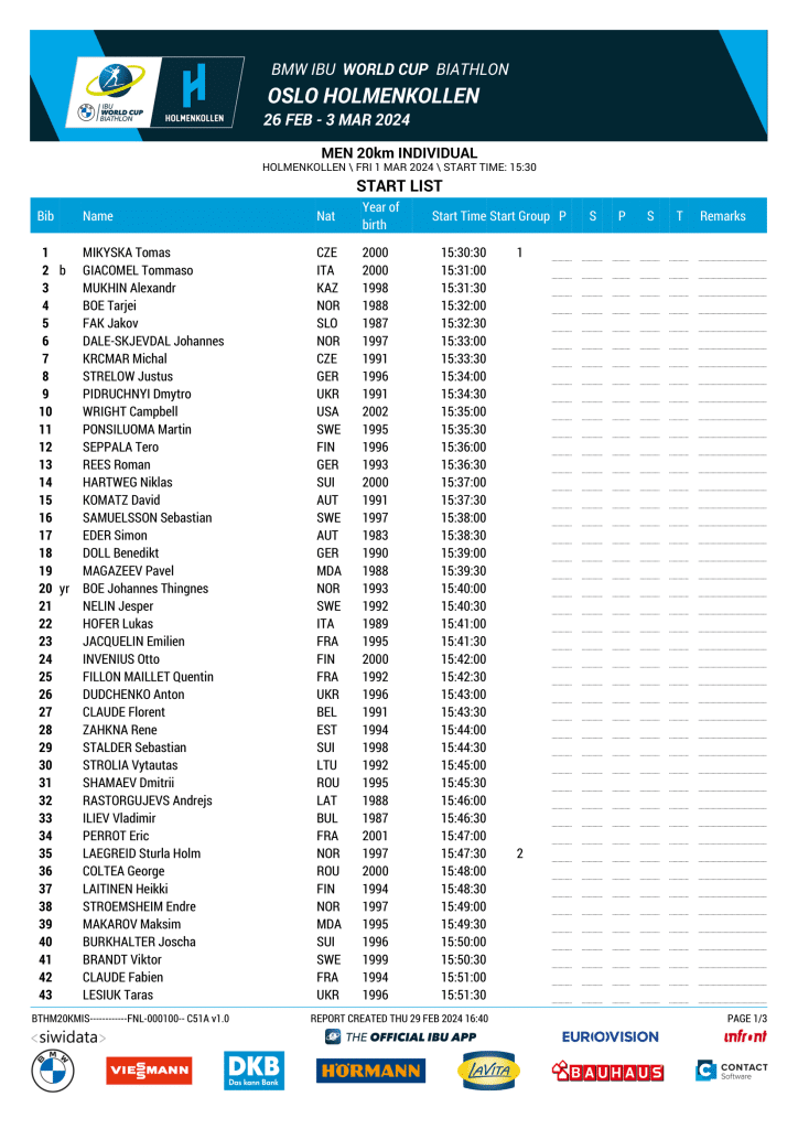 Biathlon Oslo 2024 – Liste de départ individuel Hommes