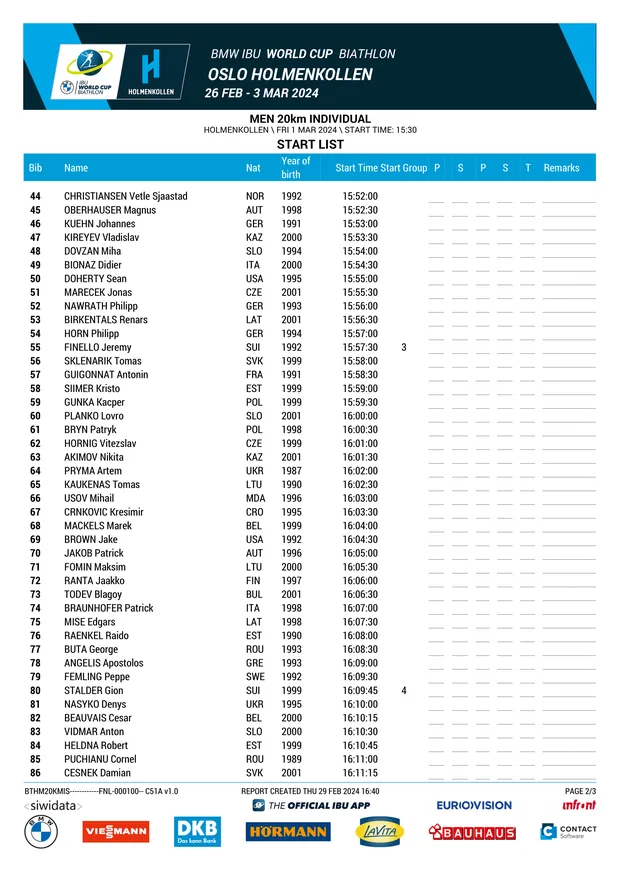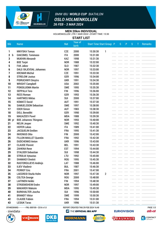 Biathlon Oslo 2024 – Liste de départ individuel Hommes