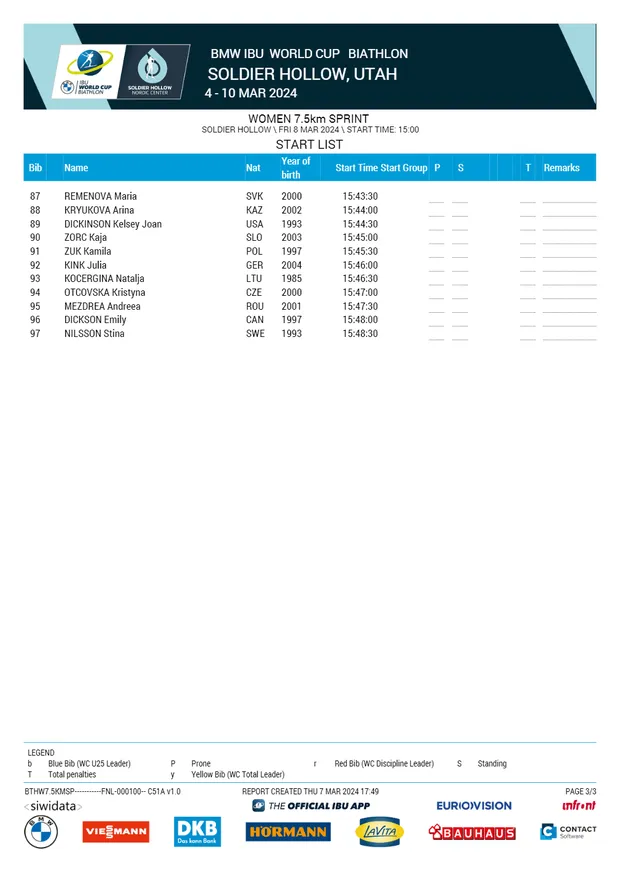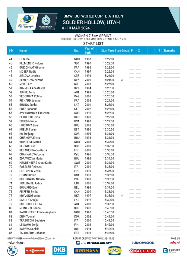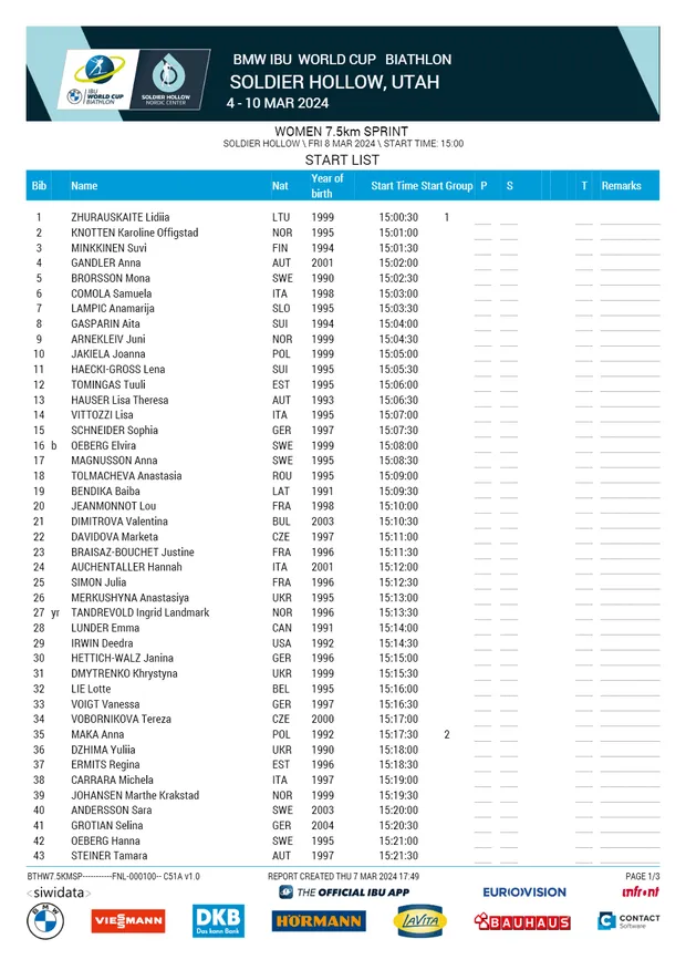 La liste de départ du sprint femmes de Soldier Hollow 2024 (Biathlon)