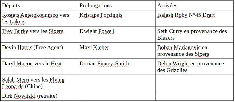 Cette saison marque tout de même la fin d’une ère dans le Texas avec le départ à la retraite de Dirk Nowitzki. Avec le recul, on peut avancer sans trop de soucis que le symbole de toute une franchise passe le relais à un Slovène qui sera perpétué son héritage. Les autres départs restent minimes et compensés par les nouveaux. Ci-dessous le tableau récapitulatif.