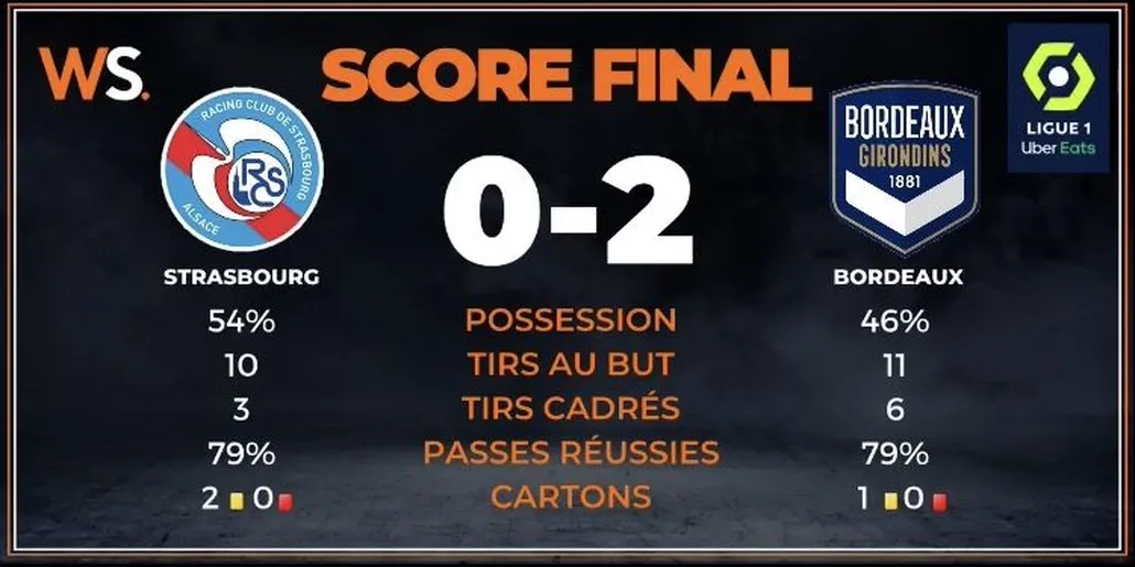 Jamais deux sans trois, Bordeaux se voit à nouveau privé d’un but hors-jeu à la 49e. Sur cette action, Mehdi Zerkane pense marquer mais Hwang, qui lui a fait la passe, se trouve en position illicite. Le gardien strasbourgeois se met en valeur à la 54e minute pour effectuer une parade sur la tentative de Rémi Oudin. À l’heure de jeu, Adrien Thomasson tente un lob mais le ballon retombe juste derrière la transversale. Otavio joue un mauvais coup aux Strasbourgeois, il inscrit le second but bordelais tout seul dans la surface (0-2). Dimitri Liénard bénéficie d’un coup franc à la 90+4, son tir oblige un arrêt de Benoît Costil et prive le RC Strasbourg du but de l’honneur. Les Alsaciens se classent à la 16e place de Ligue 1. Tandis que les Bordelais se trouvent au 13e rang du championnat.
