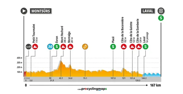 167 kilomètres seront au programme de la dernière étape des Boucles de la Mayenne 2023. Elle reliera Montsûrs à Laval. Six ascensions sont au programme de cette dont le Mont Rochard (classée en 1er catégorie). Après la traversée des communes Andouillé, Saint-Germain-le-Fouilloux et Changé, les coureurs arriveront à Laval pour entrer sur le circuit final. Les coureurs passeront cinq fois la ligne d’arrivée Boulevard Montmorency. L’arrivée est prévue peu avant 16h30.