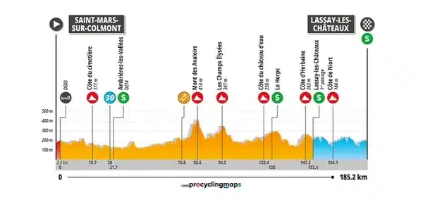 La première étape des Boucles de la Mayenne 2023 sera longue de 185,2 kilomètres. Le départ sera donné de Saint-Mars-sur-Colmont au nord de la Mayenne. Après la côte du cimetière, les coureurs traversent les communes d’Ambrières-les-Vallées, Cigné, Pré-en-Pail avant de gravir le Mont des Avaloirs, classé en 1er catégorie avant d’emprunter la côte des Champs Elysées. Un sprint intermédiaire est programmé au Horps. Le peloton fera ensuite deux boucles à Lassay-les-Châteaux pour une arrivée prévue peu avant 17h00. Ce sera l’étape la plus difficile de cette édition 2023 avec un dénivelé positif de 2.414 mètres. Il faudra donc être en forme pour espérer s’imposer.