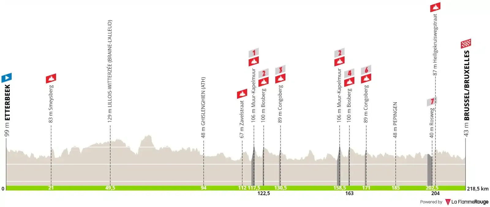 Ce dimanche, le peloton s’élancera à partir de 10 h 00 pour cette Brussels Classic 2024. 2018,5 kilomètres avec une première partie d’étape assez plate et tranquille Après 112 kilomètres, les coureurs entameront l’ascension Zavelstraat, deuxième montée de la journée et première d’un quatuor permettant de faire une première sélection avec la montée Mur de Grammont, le Bosberg et le Congoberg. Le peloton finira par le Heiligekruiswegstraat dernière ascension de la journée avant de retrouver une partie plate sur les 14 derniers kilomètres.