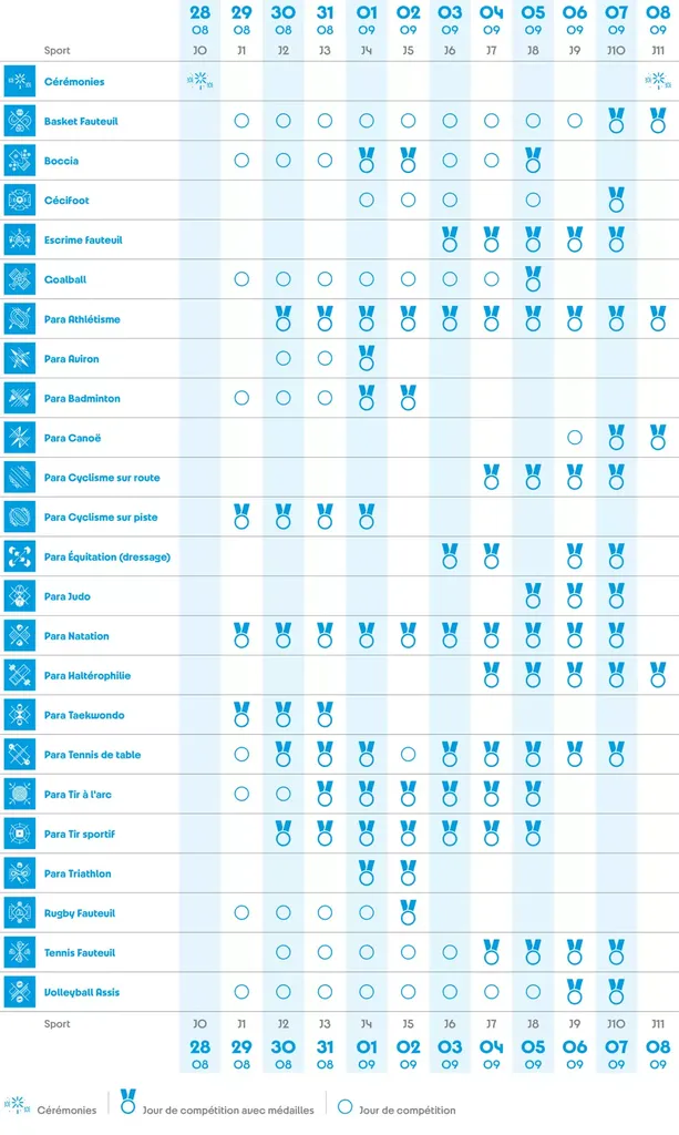 - Para athlétisme : les épreuves se dérouleront du 30 août au 7 septembre au Stade France, et le 8 septembre pour le para marathon