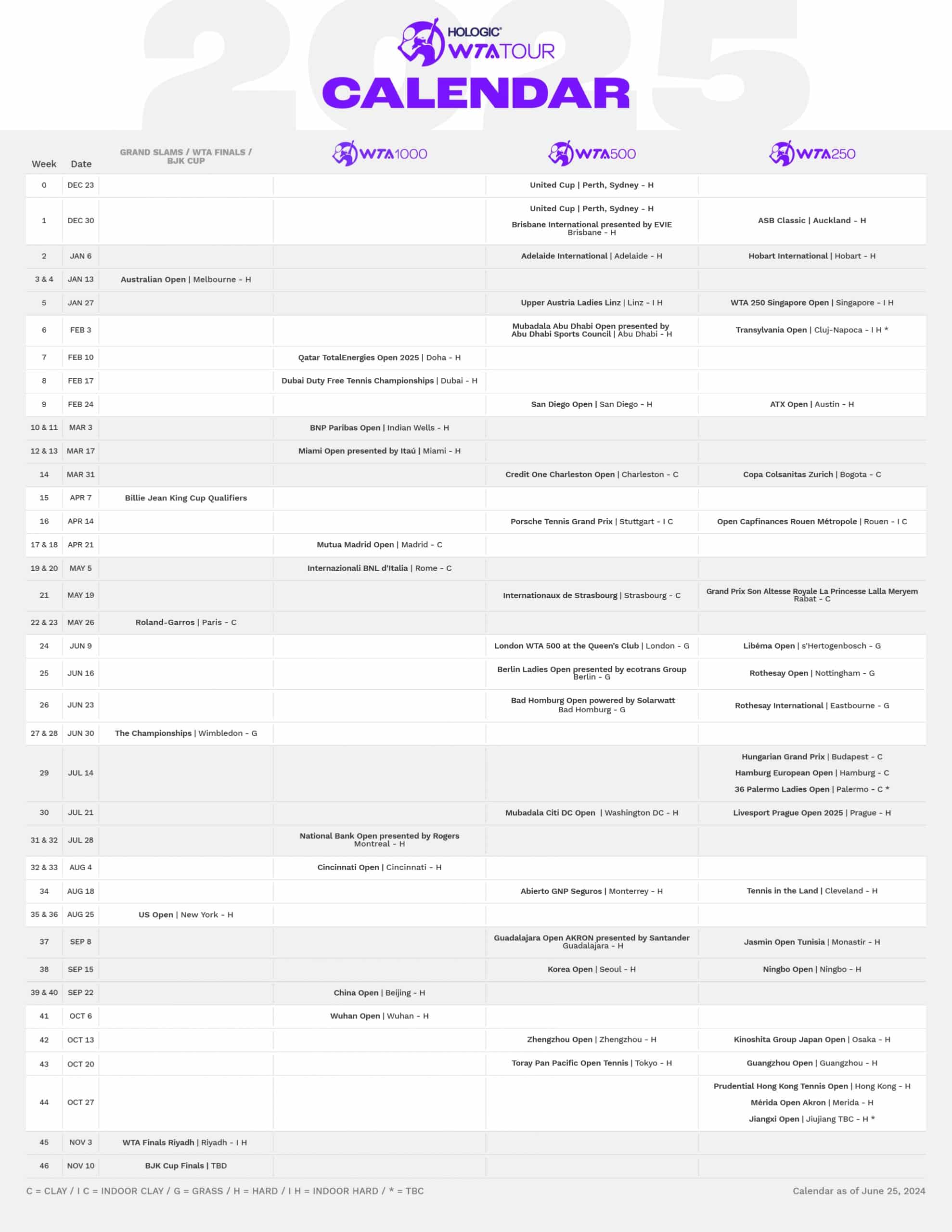 Le circuit WTA est le circuit de référence du tennis féminin. Chaque année, les meilleures joueuses au monde luttent au sein de tournois de différentes catégories, aux quatre coins du globe. Pour ne rater aucun tournoi, retrouvez toutes les dates du calendrier WTA 2024.