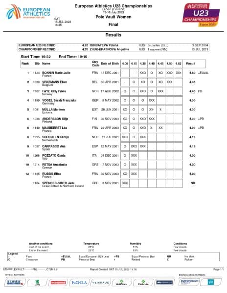 La France rafle toutes les médailles sur ces championnats d'Europe espoirs à Espoo en Finlande. La Bordelaise Marie-Julie Bonnin s'offre son premier titre en carrière lors du saut à la perche.