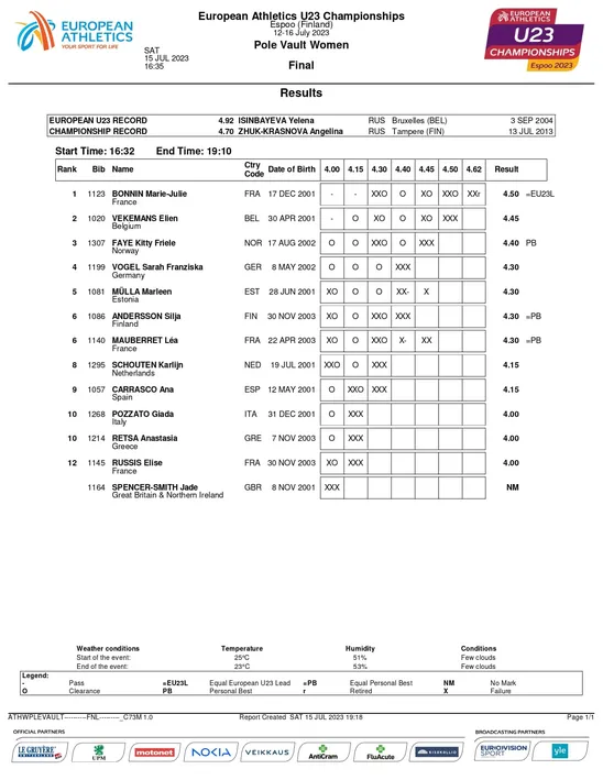 La peur avant le bonheur. Ce samedi après-midi, Marie-Julie Bonnin glane sa première médaille d’or. La Bordelaise remporte le concours de perche des championnats d’Europe espoirs grâce à un troisième essai à 4,50 m. C’est le premier titre pour la française en carrière. Les émotions prirent le dessus une fois la barre franchie. Elle a tenté 4.62 m (record personnel), mais, après deux échecs, elle décide de stopper. Le plus dur a été fait, elle est championne d’Europe. Elle s’impose devant la Belge Elien Vekemans et la Norvégienne Friele Kitty Faye. Les autres Françaises impliquées terminent respectivement sixième et douzième. Léa Mauberret a échoué à deux reprises à 4,45 m et Elise Russis est sortie après trois échecs à 4,30 m.