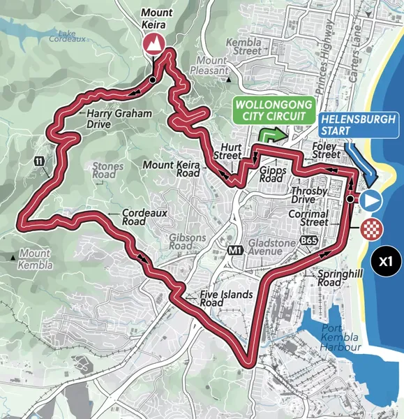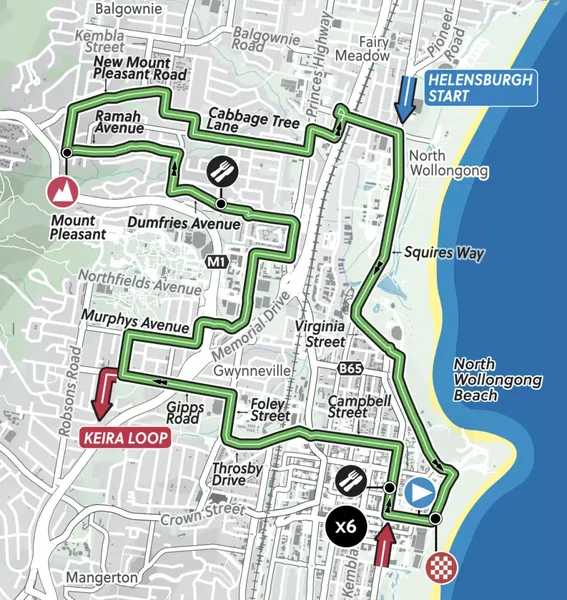 Après la zone neutre de 6,9 km pour permettre aux coureurs de descendre de Helensburgh et 27,7 km de course le long de la côte vers Wollongong, les coureurs entrent dans la boucle de 34,2 km de Mount Keira, qui abrite la plus grande ascension du parcours. Une fois dans cette boucle, pour un seul tour, il ne faut pas longtemps pour que la montée commence.