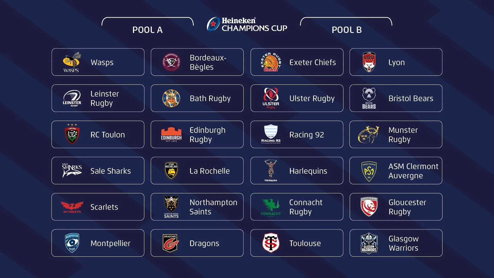 Ce sont donc les huit meilleures équipes des championnats de Top 14, du Gallagher Premiership et du Guiness Pro14 qui se disputeront le Graal européen. Les équipes sont réparties dans quatre chapeaux suivants leur place au classement à l’issue de la saison dernière. Cette année, les équipes issues du même championnat et du même chapeau ne pourront pas s’affronter en phase de poules. Les clubs du chapeau 1 joueront ceux du chapeau 4. Ceux du chapeau 2 avec le chapeau 3. Chaque club disputera quatre matchs avant de s’offrir ou non une place pour les quarts de finale.