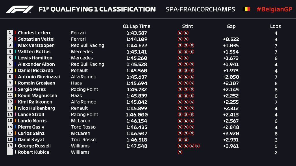 Leclerc écrase la concurrence dès son premier tour avec 6 dixième d'avance sur Hamilton qui étonnement devance un Sebastian Vettel décevant. Le trio de détache largement de Bottas, Verstappen et du peloton largement dominé par Daniel Ricciardo. Les deux Ferrari améliorent dans le premier secteur de leur deuxième tour, puis dans le deuxième. Seul Hamilton n'améliore pas dans le deuxième secteur. Leclerc améliore et décroche la pôle position devant Vettel, Hamilton, Bottas, Verstappen et les deux Renault qui pourront être déçues de leurs pénalités.