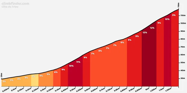 À partir de ce moment-là, la route ne sera plus vraiment plate jusqu’à la fin de la journée. Après une vingtaine de kilomètres alternant faux plat montant et descendant le peloton se présentera face aux deux montées principales de la journée : le Col du Hortilin (1,7 km à 3,7%) et le Trieu-Knokteberg (1 km à 7,9%). Une montée courte et raide avec un pied (environ 400 mètres) assez calme et une partie violente sur le sommet avec des passages à 12%. Ces deux montées s’escaladeront à 5 reprises durant la journée.