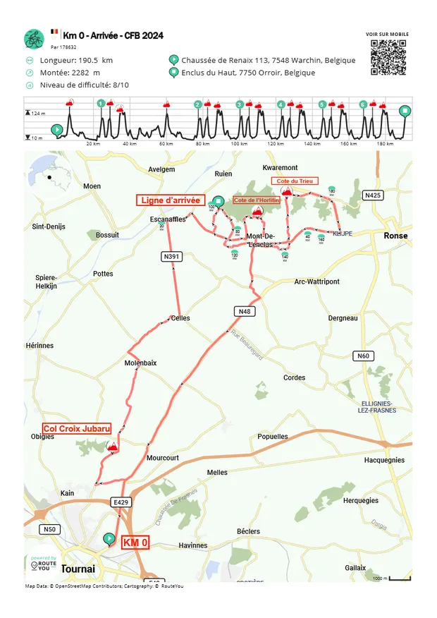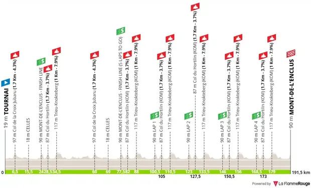 Un véritable terrain de jeu pour puncheurs. Ce mercredi 29 mai 2024, le peloton s’élancera entre Tournai jusqu’au Mont-de-l’Enclus pour 190,6 kilomètres et 2200 mètres de dénivelé. Un circuit de 5 tours avec deux ascensions très connues le fameux Trieu-Knokteberg (1 km à 7,9%) et Col du Hortilin (1,7 km à 3,7%). Le final se déroulera du côté du Mont-de-l’Enclus. Les favoris ne sont nuls autres que Marc Hirschi, Rasmus Stiller ou encore Axel Zingle.