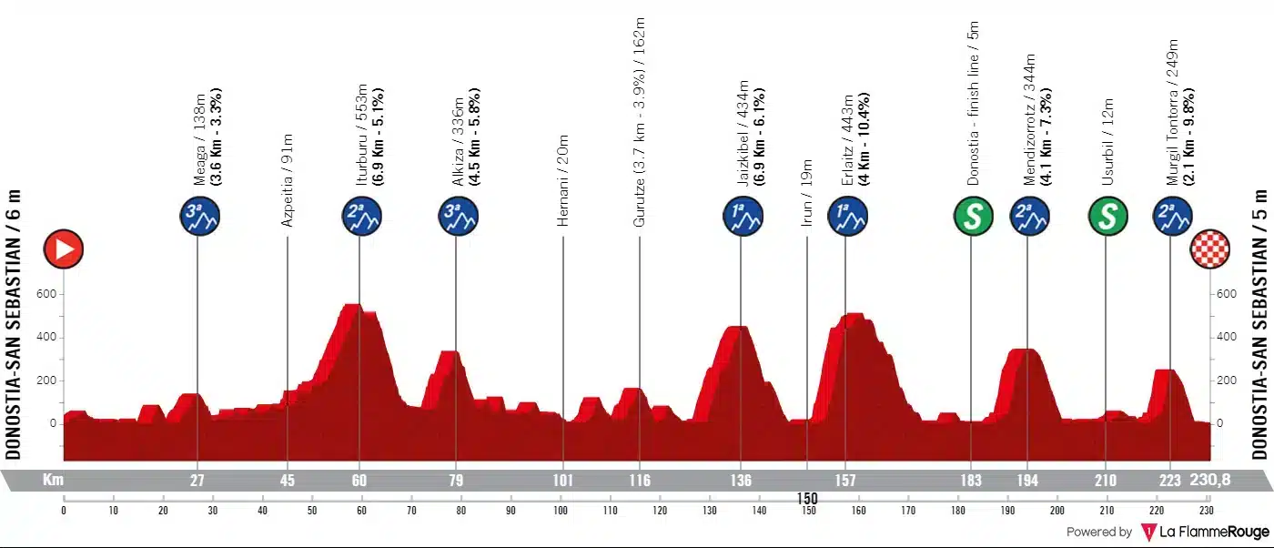 Le profil de la Clasica San Sebastian est relativement long avec 230,8 kilomètres de course. Un profil vallonné et difficile attendra les coureurs. De véritables murs sont présents sur le parcours de la Clasica San Sebastian 2023. La plupart des difficultés difficiles se trouvent dans la deuxième partie de la course avec l’Erlaitz (4,0 km à 10,3%), puis le Mendizorrotz (4,1 km à 7,3%) et enfin le Murgil Tontorra (2,1 km à 9,9%) et ses pentes extrêmement difficiles. Cette ascension devrait permettre aux coureurs les plus forts de faire la différence.