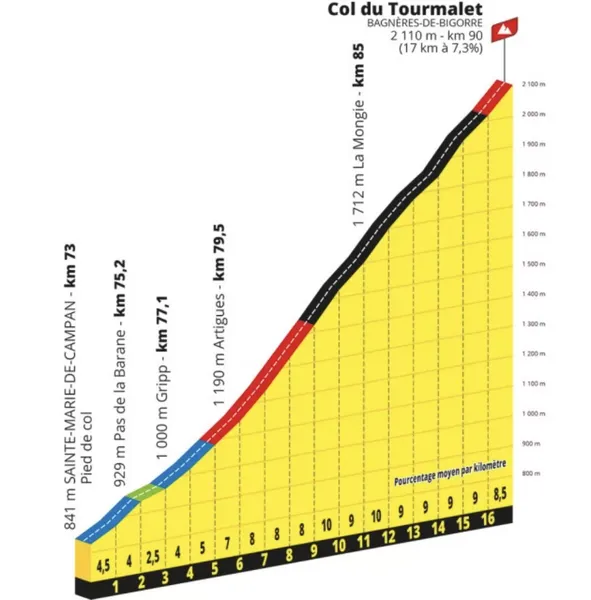 Cependant, il reste encore 5 km à parcourir, même s’ils semblent beaucoup plus longs, ce qui peut être l’occasion d’effectuer un mouvement pour creuser l’écart pour certains ou de continuer à tourner les pédales dans l’espoir de respecter le temps imparti pour d’autres. La pente se relâche à peine, se maintenant à 9% ou plus sur les pentes exposées au-dessus de La Mongie jusqu’au dernier kilomètre, où elle descend à seulement 8,5% à l’approche de la ligne d’arrivée et de la mémorable statue de fer, marquant la fin de l’étape qui pourrait bien décider de la destination finale du maillot jaune.