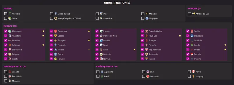 En fonction des capacités de votre ordinateur pour faire charger le jeu, vous allez sélectionner “x” nombre de championnats jouables. Et cela se fera par rapport à vos goûts. Si vous êtes plutôt ambiance latine, alors l’Amérique du Sud vous attirera sûrement. Cependant, si vous voulez découvrir l’Europe de l’Est, alors vous cochez les pays par conséquent. Au final vous restez libre de choisir le nombre de divisions que vous voulez ajouter à votre partie. Rendre chaque championnat du monde jouable est possible mais on espère que votre PC saura le supporter.