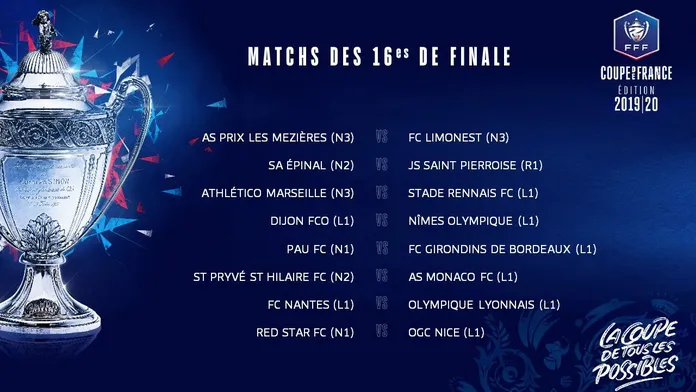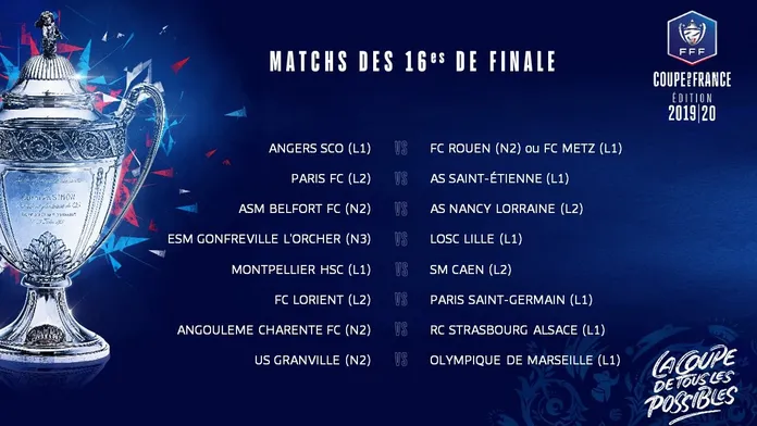 Les 16emes de finale de la Coupe de France auront lieu exceptionnellement le week-end. De quoi profiter pour les amateurs de belles affiches à domicile. Rendez-vous les 18 et 19 janvier prochain !