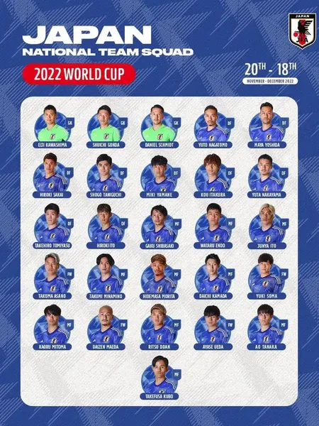 Et les attaquants le seront : Yuki Soma (Nagoya Grampus, JP), Kaoru Mitoma (Brighton, ING), Daizen Maeda (Celtic FC, ESC), Ritsu Doan (Freiburg, GER), Ayase Ueda (Cercle de Bruges, BEL), Ao Tanaka (Fortuna Düsseldorf, GER), Takefusa Kubo (Real Sociedad, ESP).
