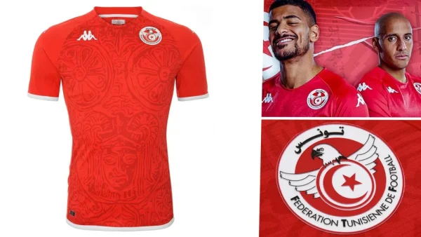 Domicile : Le maillot domicile de la Tunisie des fournisseurs Kappa est principalement rouge, mais il comporte des badges et des poignets blancs ainsi qu'un graphique imprimé subtil. Le motif sur le devant du maillot est basé sur “l'armure d'Hannibal”, le légendaire général carthaginois qui est considéré comme l'un des plus grands commandants militaires de l'histoire.