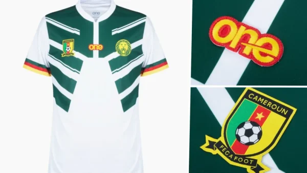 Domicile : Le Cameroun a publié de nouveaux kits pour la Coupe du monde 2022 en association avec One All Sports, mais une décision de justice pourrait encore le forcer à revenir à un accord avec Le Coq Sportif qu'il considérait comme ayant été annulé. Pour l'instant, les Lions indomptables porteront un maillot vert bordé de rouge et de jaune, avec le logo de One All Sports entre l'insigne de la fédération camerounaise et l'emblème de la tête de lion de la nation.