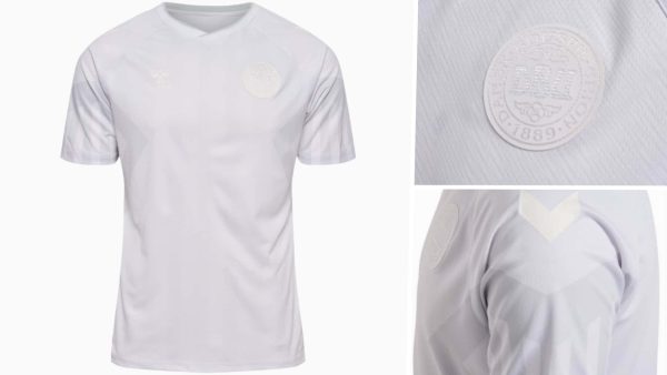Exterieur : Le kit extérieur du Danemark a le même design et les mêmes détails que le kit à domicile, mais il passe du rouge au blanc avec des logos et des imprimés ton sur ton. Le clin d'œil à 1992 est conservé sur les épaules et les manches, les Danois ayant été couronnés champions d'Europe dans un tournoi auquel ils n'ont participé qu'après la disqualification de la Yougoslavie.