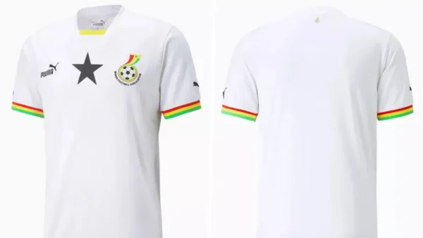 Domicile : Les Black Stars sont revenus à un design épuré et minimaliste pour leur campagne de Coupe du monde. Après avoir privilégié les motifs géométriques sur l'ensemble de son dernier maillot à domicile, le Ghana portera à nouveau du blanc uni en 2022 – avec des bordures rouges, jaunes et vertes, ainsi qu'une étoile traditionnelle au centre de la poitrine, pour ajouter une touche de couleur.