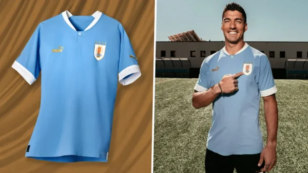 Exterieur : Puma a conservé le même thème pour tous ses maillots extérieurs en 2022, avec une boîte centrale – qui accueillera les numéros des équipes – déposée sur une base unie. L'Uruguay a opté pour le blanc, avec des touches de bleu clair. Le maillot comporte cinq bandes fines et les mots “La Celeste” sous l'encolure dans le dos.