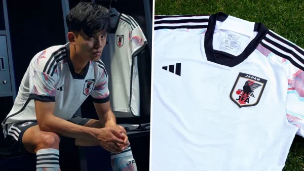 Domicile : L'origami et l'art de l'expression sont au cœur des kits de la Coupe du monde du Japon. Le graphisme glitched s'inspire du corbeau à trois pattes pour représenter la vitesse et l'art de l'origami. Il est proposé dans un coloris traditionnel bleu électrique et blanc.