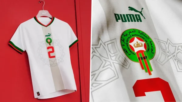 Domicile : Un bloc de rouge offre un clin d'œil au drapeau du pays, avec des éclats de vert et de blanc incorporés sur la poitrine. Puma a également ajouté une teinte verte au col et aux poignets, tandis que le mot “Maroc” est imprimé en arabe sur la nuque du maillot.