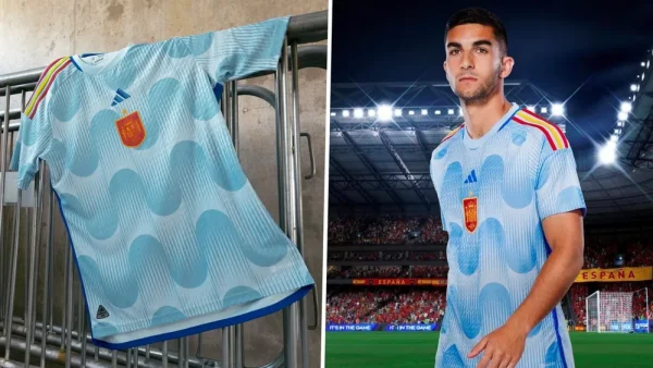Exterieur : Le logo de la Coupe du Monde 1982, date à laquelle le pays a accueilli le tournoi pour la dernière fois, est l'élément dominant du kit extérieur de l'Espagne. Le graphique de style art-déco brille dans un bleu bubblegum sur le maillot bleu ciel. Les célèbres trois bandes d'adidas de chaque côté de la manche sont traitées en rouge et jaune pour mettre en valeur les couleurs du drapeau espagnol.