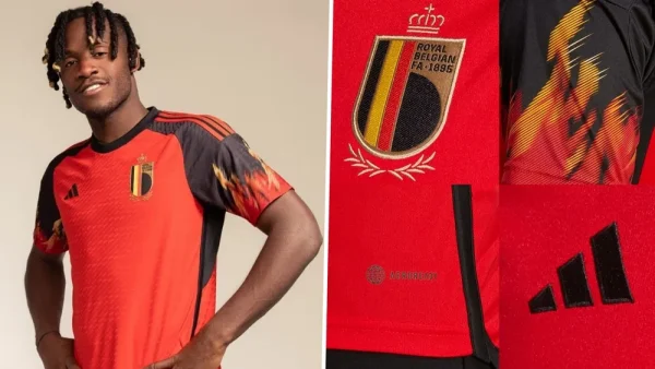 Domicile : La Belgique s'en tient à la tradition en optant pour un torse rouge et des manches noires, mais elle rompt avec le moule lorsqu'il s'agit de flammes sur les bras. Les graphismes ont un aspect légèrement numérisé, tandis que l'insigne de la nation reçoit une finition dorée brillante.