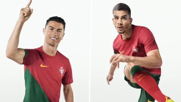 Domicile : Pour la toute première fois, le Portugal a opté pour un design moitié-moitié pour son kit domicile 2022. Le rouge poivre et le vert gorge qui constituent le drapeau du pays sont mis sur un pied d'égalité. Les logos dorés restent en place, Nike fêtant ses 25 ans en tant que fournisseur de l'équipement national.