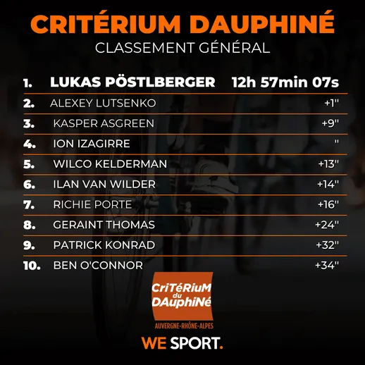 Richie Porte ne répond pas vraiment aux attentes à vingt-trois jours du départ du Tour de France. L’Australien bat le record au premier pointage intermédiaire détenu par Brandon McNulty. Mais il cale dans le final et va concéder 15 s sur le vainqueur du jour. Rien d’alarmant pour l’Australien. Une des bonnes opérations du jour est réalisée par Miguel Ángel López. Le Colombien termine à 43 s de Lutsenko. Quant à son compatriote Nairo Quintana, le contre-la-montre ne s’est pas aussi bien passé. Le Colombien termine à 1 min 15 s du vainqueur. Ilan Van Wilder fait également une bonne opération, le jeune Belge terminant à 13 s d’Alexey Lutsenko. Geraint Thomas déçoit. Le Gallois termine à 22 s du champion kazakh. Son gros braquet lui a coûté du temps dans une deuxième partie légèrement vallonnée. Ineos devra attaquer pour reprendre du temps aux favoris dans les prochains jours. Au général, Richie Porte compte 16 s de retard sur Lukas Pöstlberger, tandis que Geraint Thomas se trouve à 24 s de la tête.