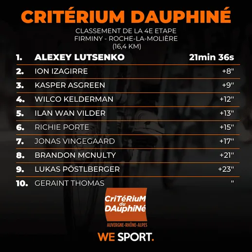 Premier test pour les favoris sur ce Critérium du Dauphiné. Un contre la montre de 16 km remporté par Alexey Lutsenko. Lukas Pöstlberger conserve son maillot jaune pour une seconde.